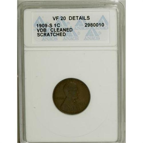 <B>1909-S VDB 1C --Cleaned, Scratched--ANACS. VF20 Details.</B></I> This medium brown example has a slightly glossy portrait and a few light reverse pinscratches. A hint of verdigris is noted beneath AMERICA and above the U in UNITED.<BR><BR><b>Shipping:</b> Coins & Currency (<a target="_blank" href="http://www.heritageauctions.com/common/shipping.php">view shipping information</a>)