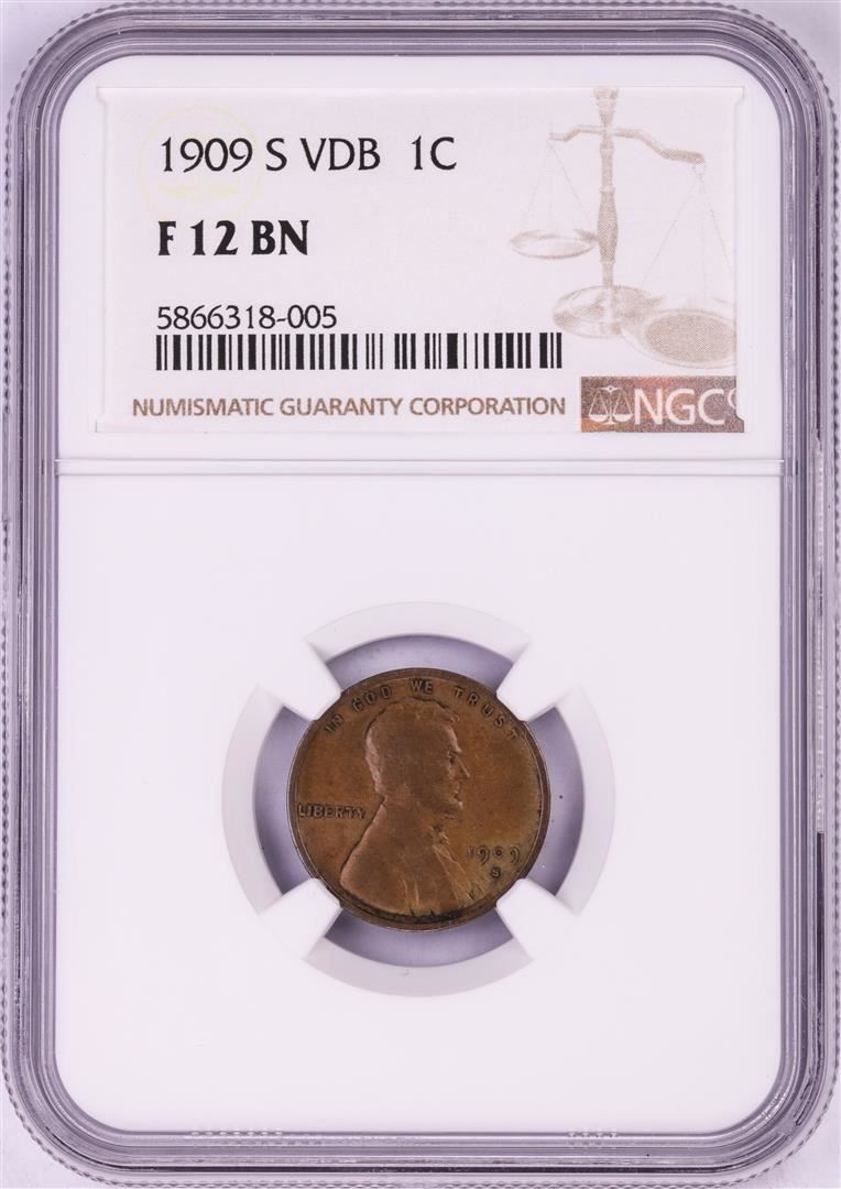 One 1909-S VDB Lincoln Wheat Cent Coin NGC F12BN. NGC Certified.