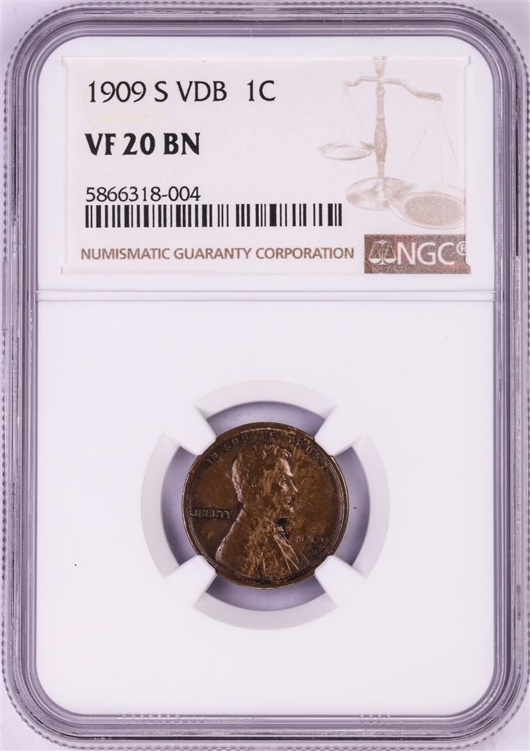 One 1909-S VDB Lincoln Wheat Cent Coin NGC VF20BN. NGC Certified.