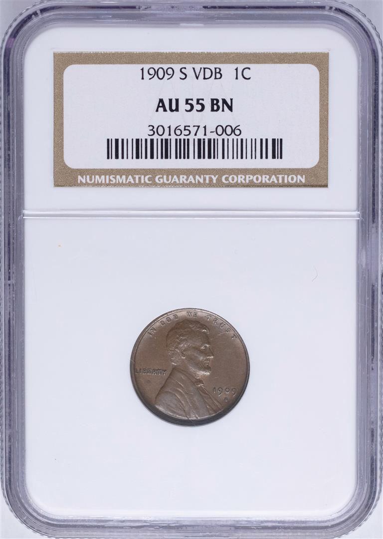One 1909-S VDB Lincoln Wheat Penny Coin NGC AU55 BN. NGC Certified.