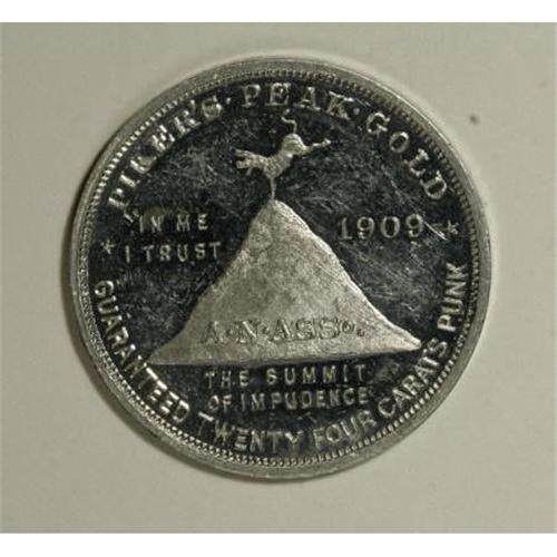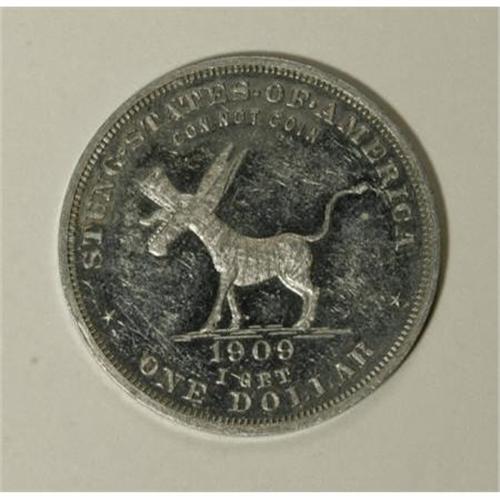 <B>1909 Stung States of America Token.</B></I> Aluminum, 31 mm. Anti-Democrat propaganda piece with braying donkey on the obverse. A donkey is precariously balanced on the peak of a hill on the reverse. Both sides have desultory legends. Full prooflike luster but the fields are abraded.<BR><BR><b>Shipping:</b> Coins & Currency (<a target="_blank" href="http://www.heritageauctions.com/common/shipping.php">view shipping information</a>)