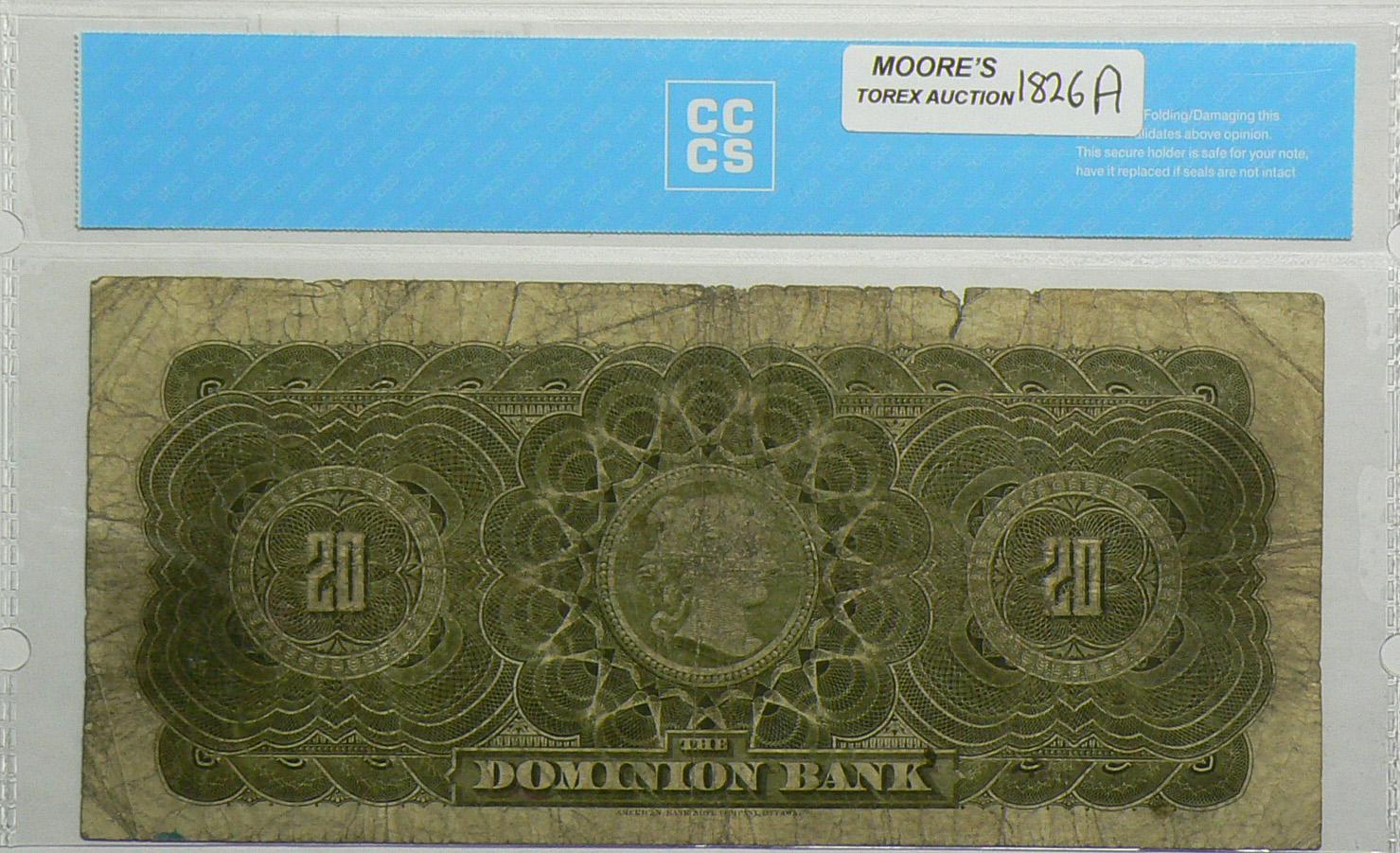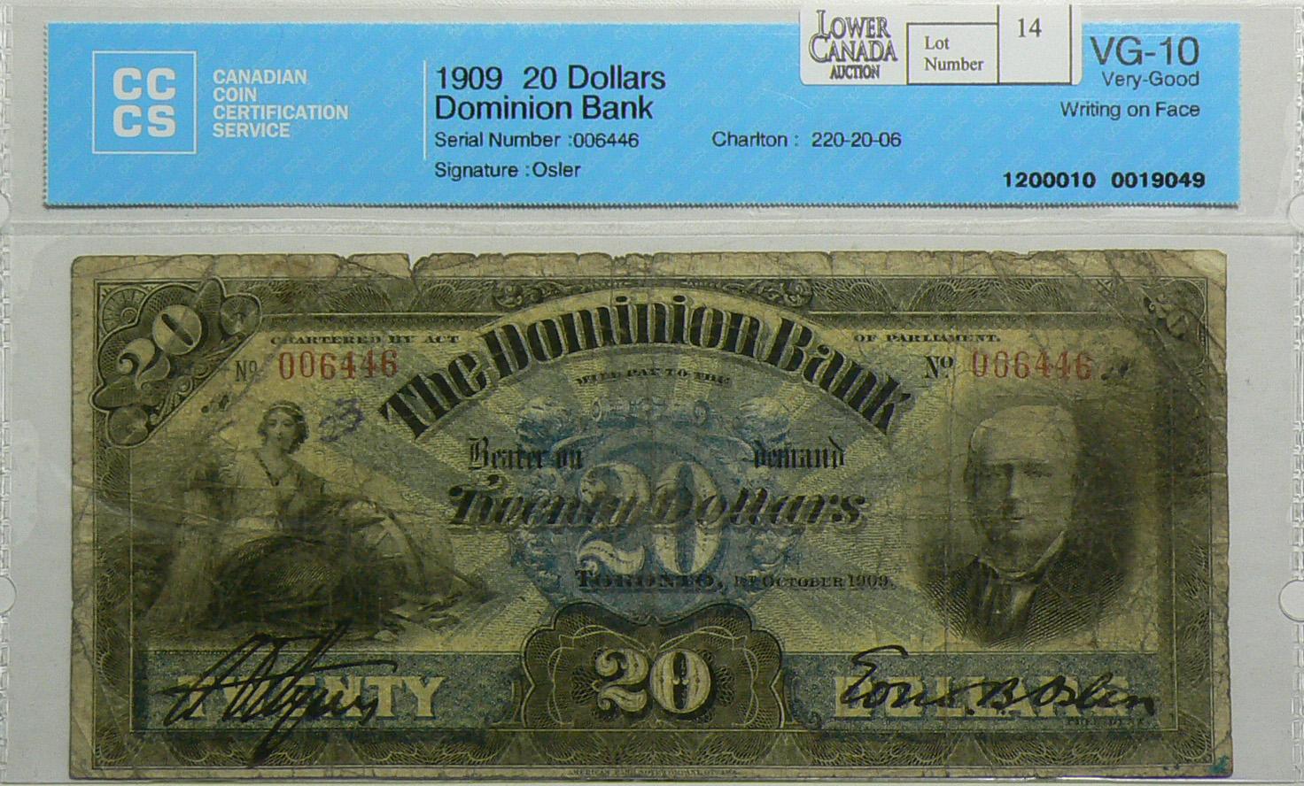 1909 Twenty Dollars Dominion Bank, 220-20-06, CCCS VG-10, Osler, Letter A, serial 006446, writing