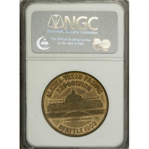 <B>1909 U.S. Gov't Bldg, HK-367, MS63 NGC.</B></I> Brass, reeded edge, 36.5 mm, "very scarce" (HK, 1963). The somewhat muted luster in some areas is apparently all that precludes a finer grade, as the surfaces are pristine and show no distractions otherwise.<BR><BR><b>Shipping:</b> Coins & Currency (<a target="_blank" href="http://www.heritageauctions.com/common/shipping.php">view shipping information</a>)