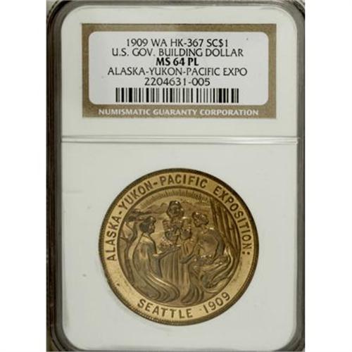 <B>1909 U.S. Gov't Bldg, HK-367, MS64 Prooflike NGC.</B></I> Brass, reeded edge, 36.5 mm, "very scarce" (HK, 1963). A beautiful and fully prooflike piece of this elusive issue, with "U.S. GOVERNMENT BUILDING" in small letters on the reverse. The <I>single finest graded </B></I>at NGC (8/07).<BR><BR><b>Shipping:</b> Coins & Currency (<a target="_blank" href="http://www.heritageauctions.com/common/shipping.php">view shipping information</a>)