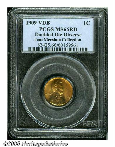 <B>1909 VDB<1C> Doubled Die Obverse MS66 Red PCGS.</B></I> FS-012. The 190 in the date and the TY in LIBERTY is strongly die doubled on this important premium Gem. Likely among the finest examples of the variety. A lustrous and impressively preserved piece with gold color that is slighter deeper on the borders than in the centers. The reverse exhibits a grainy, matte-like finish.<BR><I>From The Tom Mershon #2 All-Time PCGS Registry Set of Lincoln Wheat Cents.</B></I>
