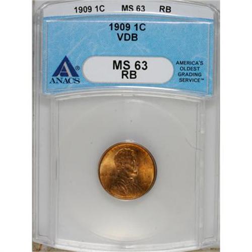 <B>1909 VDB 1C MS63 Red and Brown ANACS.</B></I> NGC Census: (196/888). PCGS Population (78/778). Mintage: 27,995,000. Numismedia Wsl. Price for NGC/PCGS coin in MS63: $23. (#2424)<BR><BR><b>Shipping:</b> Coins & Currency (<a target="_blank" href="http://www.heritageauctions.com/common/shipping.php">view shipping information</a>)