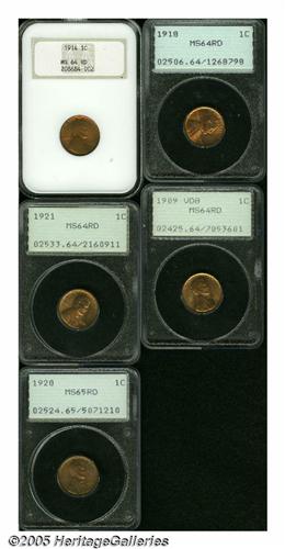 <B>1909 VDB<1C> MS64 Red PCGS,</B></I> boldly struck, dashes of tan color on the reverse; <B>1914 MS64 Red NGC,</B></I> variegated orange and olive color, a concealed mark below the bowtie; <B>1918 MS64 Red PCGS,</B></I> some shallow strike-thrus and scattered flyspecks; <B>1920 MS65 Red PCGS,</B></I> peach and apple-green color, one small spot on each side; and a <B>1921 MS64 Red PCGS,</B></I> well struck, lilac color on the upper reverse. All five pieces are in early generation holders.