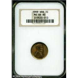 1909 VDB 1C MS66 Red NGC. Coppery-gold patination <B>1909 VDB 1C MS66 Red NGC.</B></I> Coppery-gold patination reveals subtle pale-green accents around the borders. The design elements are sharply struck, and the lustrous surfaces are virtually devoid of any abrasions. <BR><BR><B>Important notice:</B> Heritage usually auctions material at the rate of 200-250 lots per hour. On some occasions eBay Live bid software or the Internet may not be able to keep up with the pace of the auction. We recommend placing a realistic absentee bid now as insurance to avoid disappointment. Occasionally the auctioneer may eliminate or reject an eBay Live bid, and the auctioneer may also reopen a lot after the close of the eBay live bidding (usually because we missed an audience bid), and may reject your bid even if it shows you as the winning bidder. By bidding via eBay Live, you agree that Heritage may award the lot to another bidder at its sole discretion under the circumstances described above or any other reasonable circumstances. Since eBay bids are not shown to us until we open the lot on the floor, we treat those bids just like floor bids. In most cases the floor responds before the eBay bid is presented to us, due to Internet lag time, so for consistency we have made it a policy that floor bids are always considered first over tie eBay live bids. Also please note that all Heritage lots purchased through eBay Live carry a 20% Buyer's Premium. Please make sure you read the Terms and Conditions before you bid. This lot is being auctioned in conjunction with a live floor auction by Heritage Galleries & Auctioneers. All final auction and invoice information will be supplied by Heritage Galleries & Auctioneers, and all other information should be considered preliminary. Lot:5193