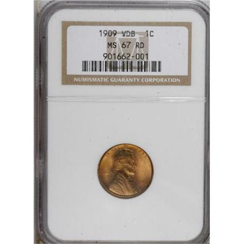 <B>1909 VDB 1C MS67 Red NGC.</B></I> A solidly struck reddish-orange example of this popular one-year variety. NGC and PCGS have each certified just one Red-designated piece finer (10/07). <BR><BR><B>Coin Engraver:</B> Victor D. Brenner<BR><BR><b>Shipping:</b> Coins & Currency (<a target="_blank" href="http://www.heritageauctions.com/common/shipping.php">view shipping information</a>)