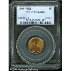 1909 VDB 1C MS67 Red PCGS. A beautifully matte-lik <B>1909 VDB 1C MS67 Red PCGS.</B></I> A beautifully matte-like Superb Gem with rich red-orange color and flaming luster. An exquisitely preserved Lincoln cent that displays a pristine obverse and a single notable mark on the upper right wheat stalk on the reverse. Population: 163 in 67, 1 finer (10/04). <BR><BR><B>Important notice:</B> Heritage usually auctions material at the rate of 200-250 lots per hour. On some occasions eBay Live bid software or the Internet may not be able to keep up with the pace of the auction. We recommend placing a realistic absentee bid now as insurance to avoid disappointment. Occasionally the auctioneer may eliminate or reject an eBay Live bid, and the auctioneer may also reopen a lot after the close of the eBay live bidding (usually because we missed an audience bid), and may reject your bid even if it shows you as the winning bidder. By bidding via eBay Live, you agree that Heritage may award the lot to another bidder at its sole discretion under the circumstances described above or any other reasonable circumstances. Since eBay bids are not shown to us until we open the lot on the floor, we treat those bids just like floor bids. In most cases the floor responds before the eBay bid is presented to us, due to Internet lag time, so for consistency we have made it a policy that floor bids are always considered first over tie eBay live bids. Also please note that all Heritage lots purchased through eBay Live carry a 20% Buyer's Premium. Please make sure you read the Terms and Conditions before you bid. This lot is being auctioned in conjunction with a live floor auction by Heritage Galleries & Auctioneers. All final auction and invoice information will be supplied by Heritage Galleries & Auctioneers, and all other information should be considered preliminary. Lot:5194