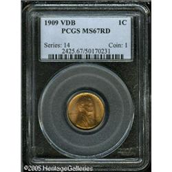 <B>1909 VDB 1C MS67 Red PCGS.</B></I> Sharply struck, with pleasing coppery-gold color and clean surfaces. This coin generates great eye appeal. Lot:5359