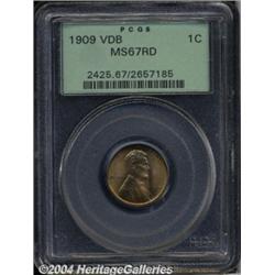 <B>1909 VDB<1C> MS67 Red PCGS.</B></I> Orange and gold colors intermingle throughout this highly lustrous and meticulously struck Superb Gem. An attractively preserved first year representative. Housed in a green label PCGS holder.<BR><I>From The Del Rio Collection, Part One.</B></I> <BR><BR><B>Important notice:</B> Heritage usually auctions material at the rate of 200-250 lots per hour. On some occasions eBay Live bid software or the Internet may not be able to keep up with the pace of the auction. We recommend placing a realistic absentee bid now as insurance to avoid disappointment. Occasionally the auctioneer may eliminate or reject an eBay Live bid, and the auctioneer may also reopen a lot after the close of the eBay live bidding (usually because we missed an audience bid), and may reject your bid even if it shows you as the winning bidder. By bidding via eBay Live, you agree that Heritage may award the lot to another bidder at its sole discretion under the circumstances described above or any other reasonable circumstances. Since eBay bids are not shown to us until we open the lot on the floor, we treat those bids just like floor bids. In most cases the floor responds before the eBay bid is presented to us, due to Internet lag time, so for consistency we have made it a policy that floor bids are always considered first over tie eBay live bids. Also please note that all Heritage lots purchased through eBay Live carry a 20% Buyer's Premium. Please make sure you read the Terms and Conditions before you bid. </span></font></tr></table></td></tr></table>