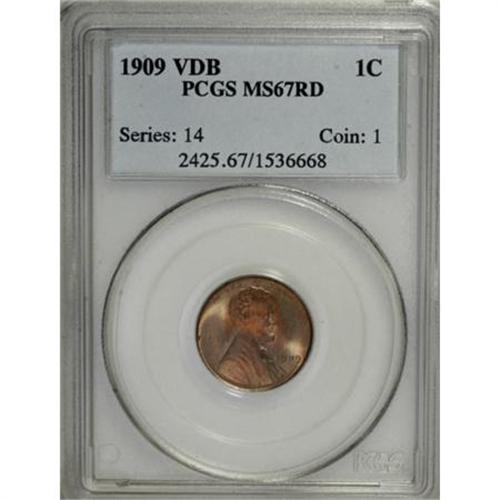 <B>1909 VDB 1C MS67 Red PCGS.</B></I> Peach and green-gold dominate this thoroughly lustrous and precisely struck Superb Gem. The obverse is virtually perfect, and the reverse border has only inconsequential carbon.<BR><BR><B>Coin Engraver:</B> Victor D. Brenner<BR><BR><b>Shipping:</b> Coins & Currency (<a target="_blank" href="http://www.heritageauctions.com/common/shipping.php">view shipping information</a>)