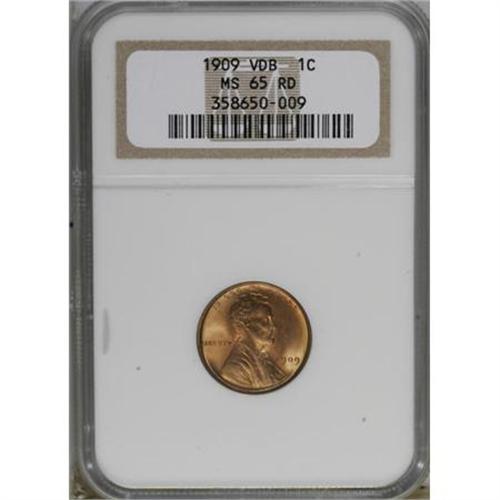 <B>1909 VDB 1C MS65 Red NGC.</B></I> NGC Census: (1810/1086). PCGS Population (3331/1764). Mintage: 27,995,000. Numismedia Wsl. Price for NGC/PCGS coin in MS65: $105. (#2425)<BR><BR><B>Coin Engraver:</B> Victor D. Brenner<BR><BR><b>Shipping:</b> Coins & Currency (<a target="_blank" href="http://www.heritageauctions.com/common/shipping.php">view shipping information</a>)