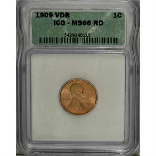 <B>1909 VDB 1C MS66 Red ICG.</B></I> NGC Census: (1016/72). PCGS Population (1580/185). Mintage: 27,995,000. Numismedia Wsl. Price for NGC/PCGS coin in MS66: $300. (#2425)<BR><BR><B>Coin Engraver:</B> Victor D. Brenner<BR><BR><b>Shipping:</b> Coins & Currency (<a target="_blank" href="http://www.heritageauctions.com/common/shipping.php">view shipping information</a>)