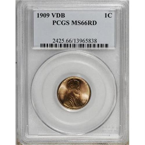 <B>1909 VDB 1C MS66 Red PCGS.</B></I> PCGS Population (1574/185). NGC Census: (1014/72). Mintage: 27,995,000. Numismedia Wsl. Price for NGC/PCGS coin in MS66: $260. (#2425)<BR><BR><B>Coin Engraver:</B> Victor D. Brenner<BR><BR><b>Shipping:</b> Coins & Currency (<a target="_blank" href="http://www.heritageauctions.com/common/shipping.php">view shipping information</a>)