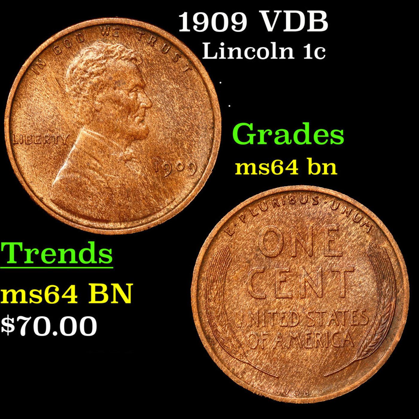 1909 VDB Lincoln Cent 1c Grades Choice Unc BN. Always sought after date. Always popular.