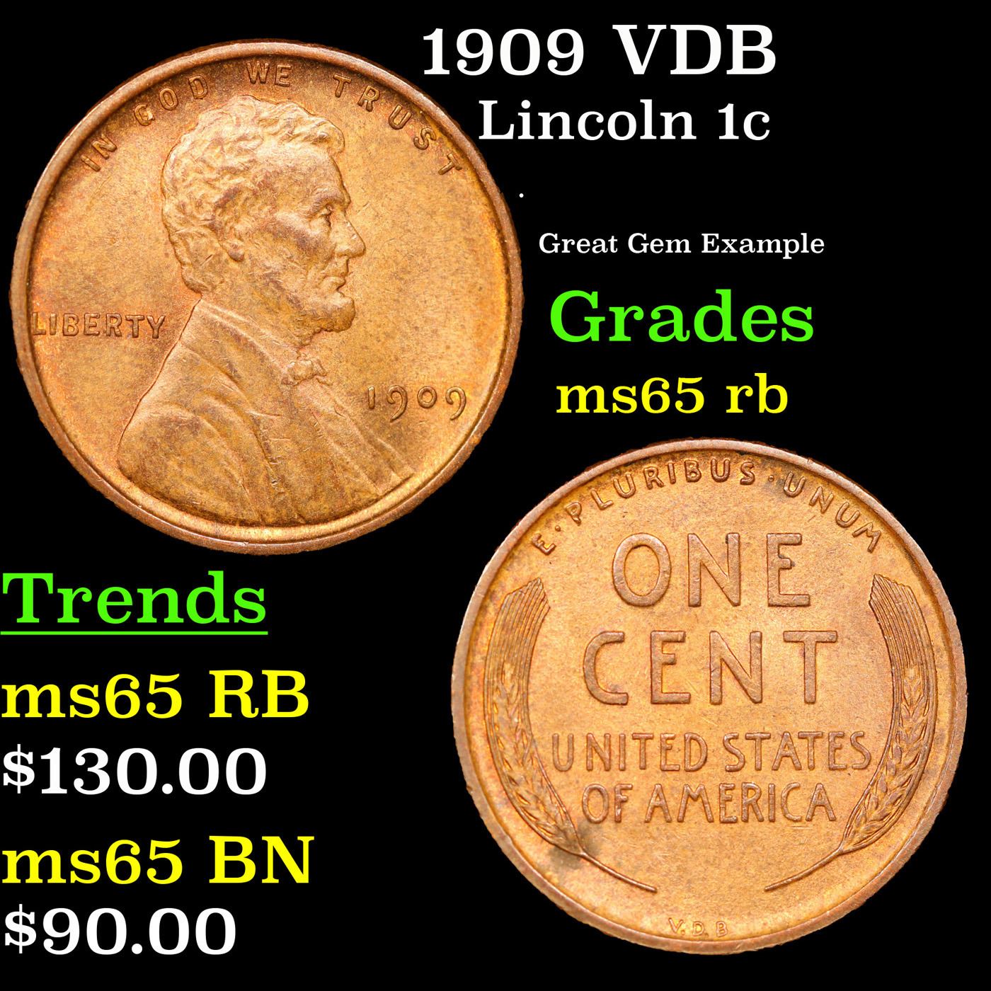 1909 VDB Lincoln Cent 1c Grades GEM Unc RB. Always sought after date. Always popular.