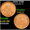 1909 VDB Lincoln Cent 1c Grades GEM+ Unc RB. Always sought after date. Always popular.