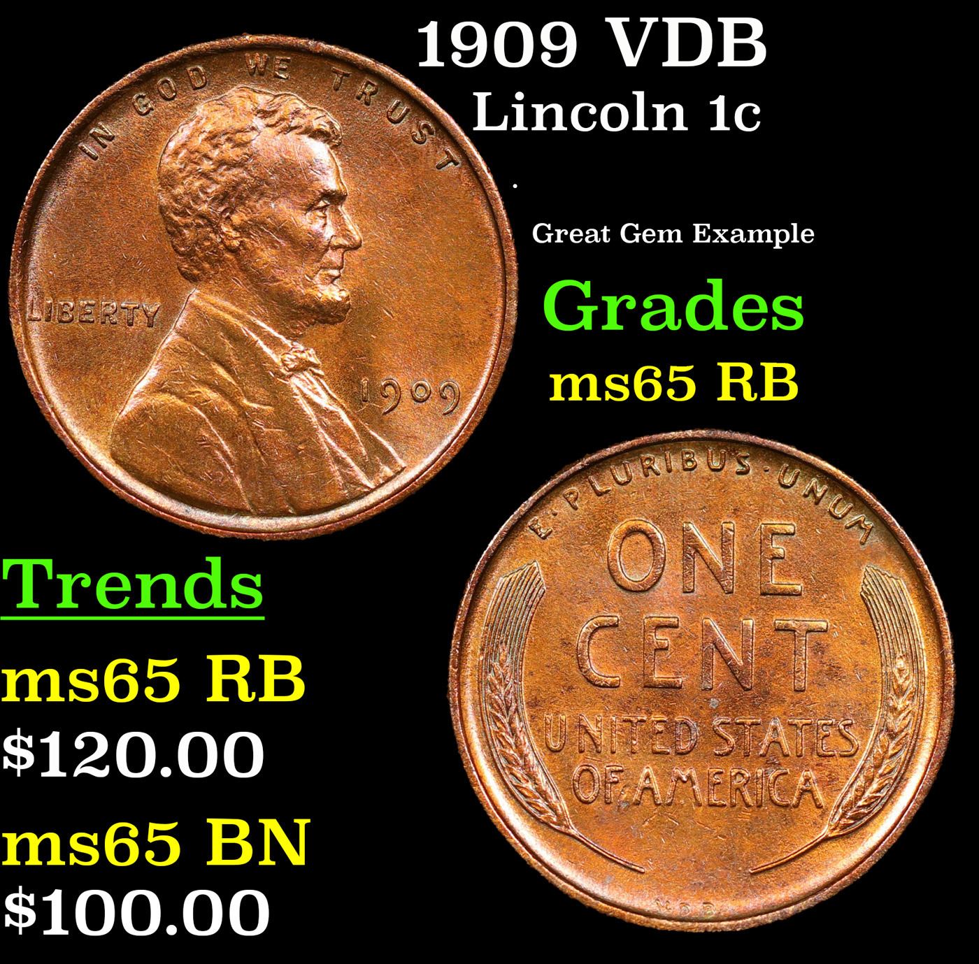 1909 VDB Lincoln Cent 1c Grades GEM Unc RB. Always sought after date. Always popular.