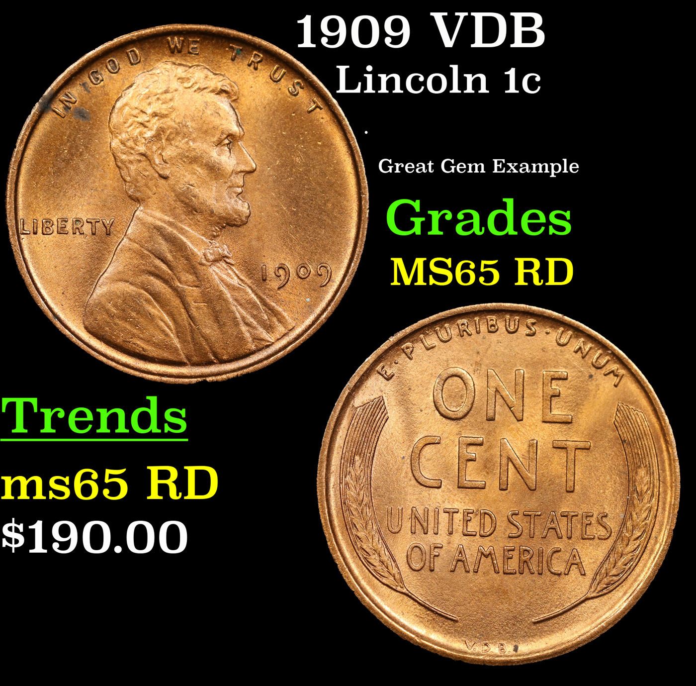 1909 VDB Lincoln Cent 1c Grades GEM Unc RD. Always sought after date. Always popular.