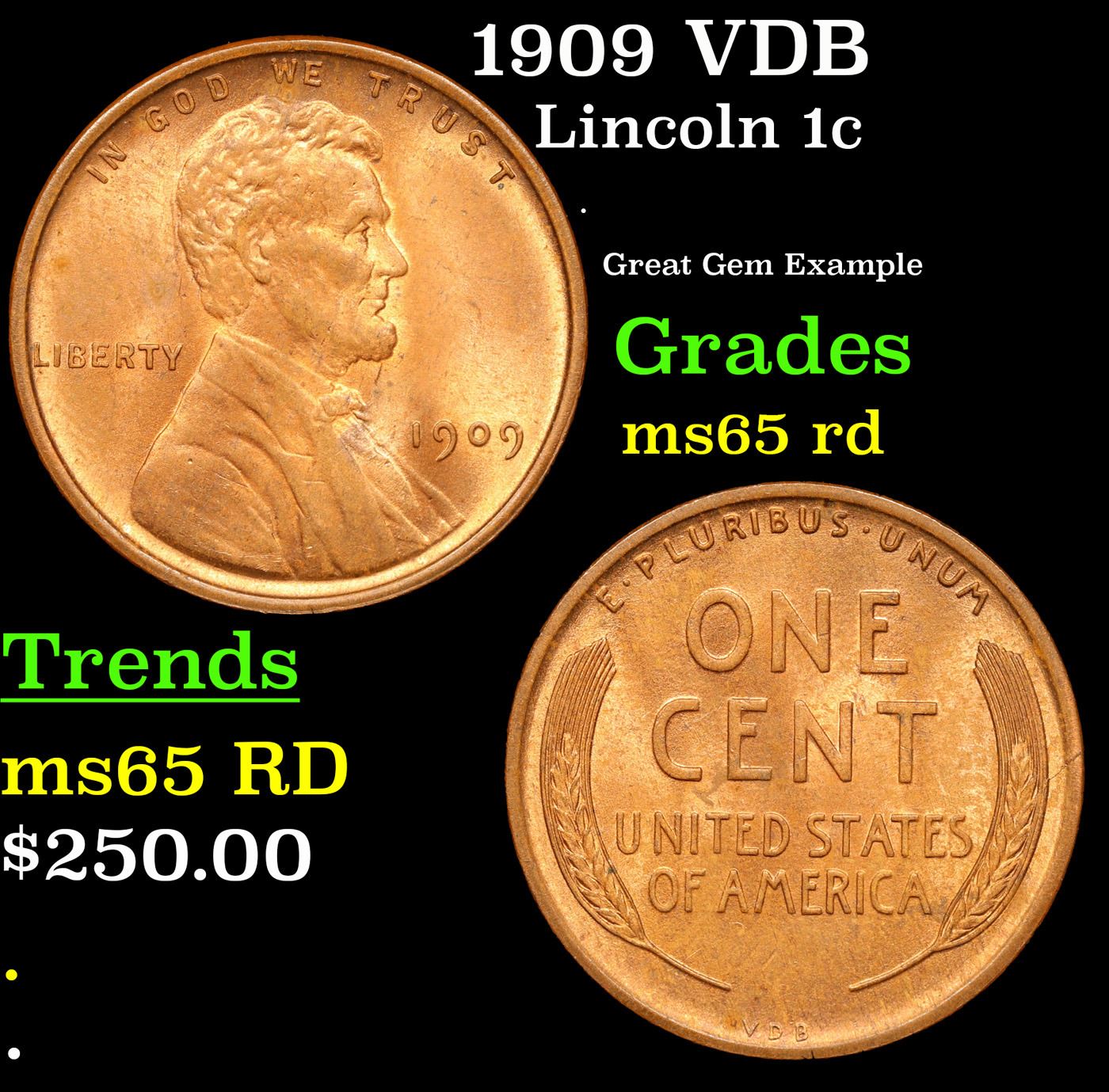 1909 VDB Lincoln Cent 1c Grades GEM Unc RD. Always sought after date. Always popular.