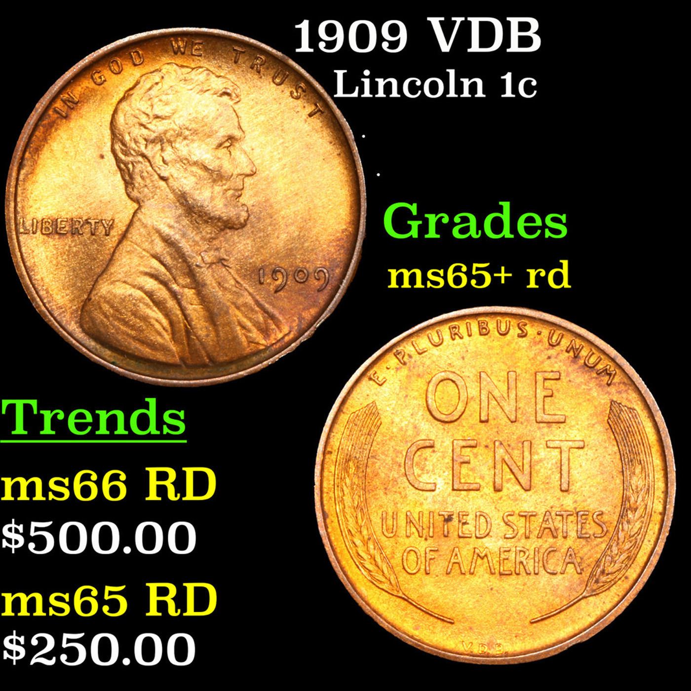 1909 VDB Lincoln Cent 1c Grades Gem+ Unc RD. Always sought after date. Always popular.