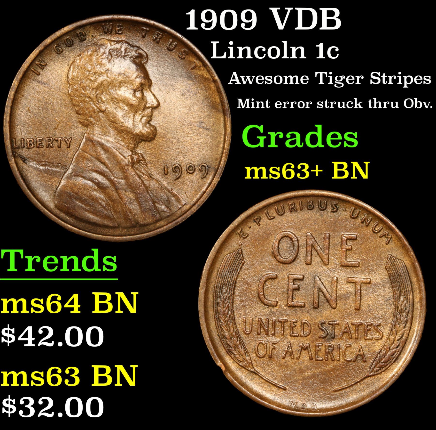 1909 VDB Lincoln Cent 1c Grades Select+ Unc BN. Always sought after date. Always popular. Awesome Tiger Stripes; Mint error struck thru Obv.