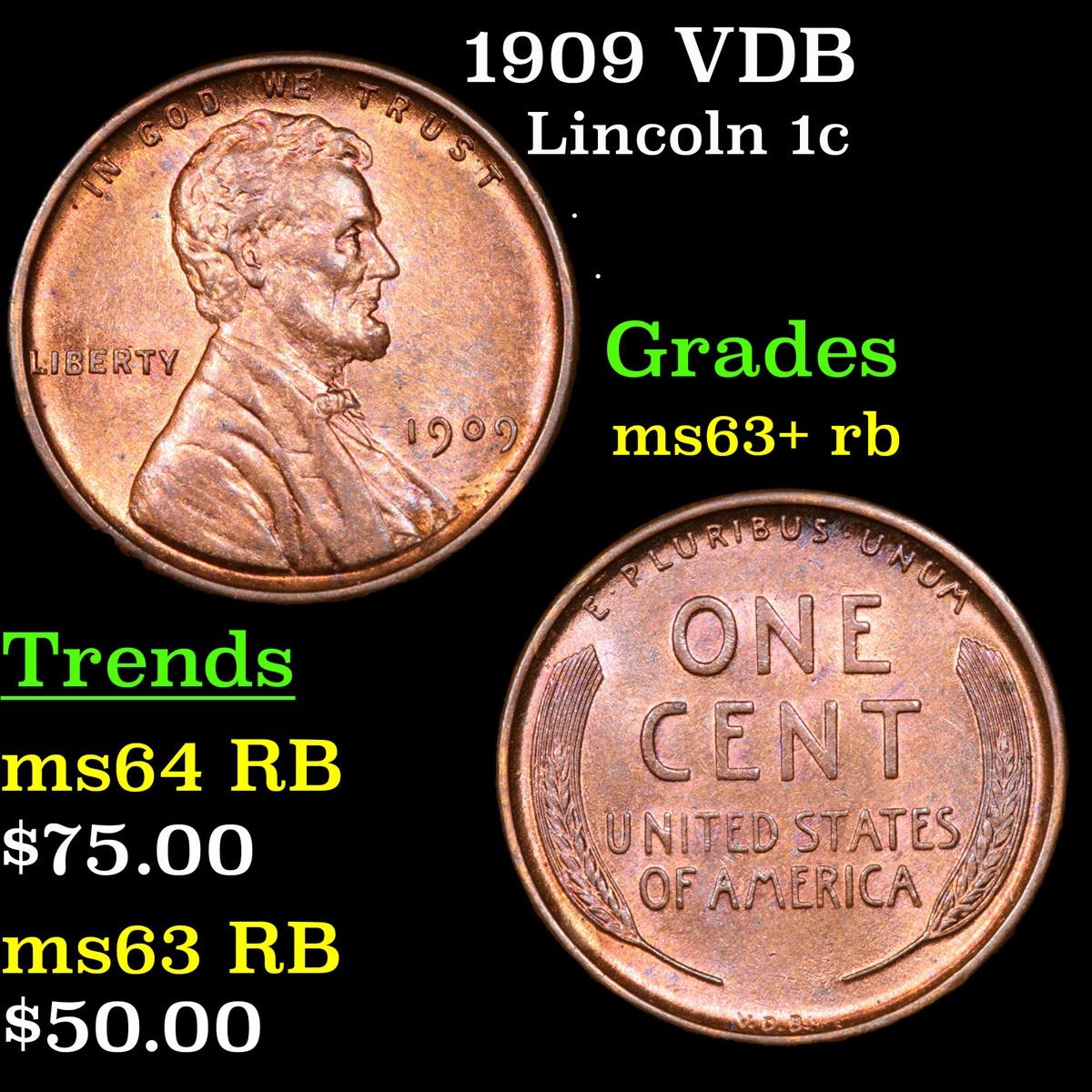 1909 VDB . . Lincoln Cent 1c Grades Select+ Unc RB. Always sought after date. Always popular.
