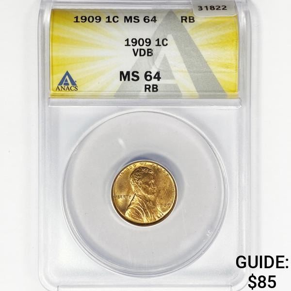 1909 VDB Wheat Cent ANACS MS64 RB