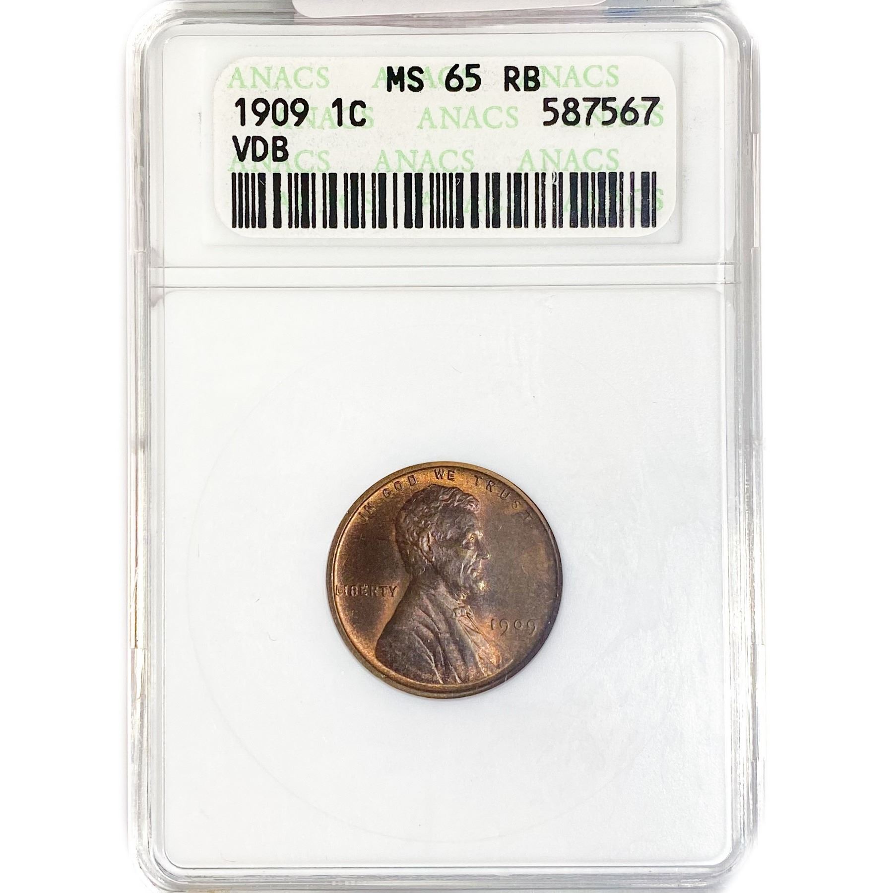 1909 VDB Wheat Cent ANACS MS65 RB