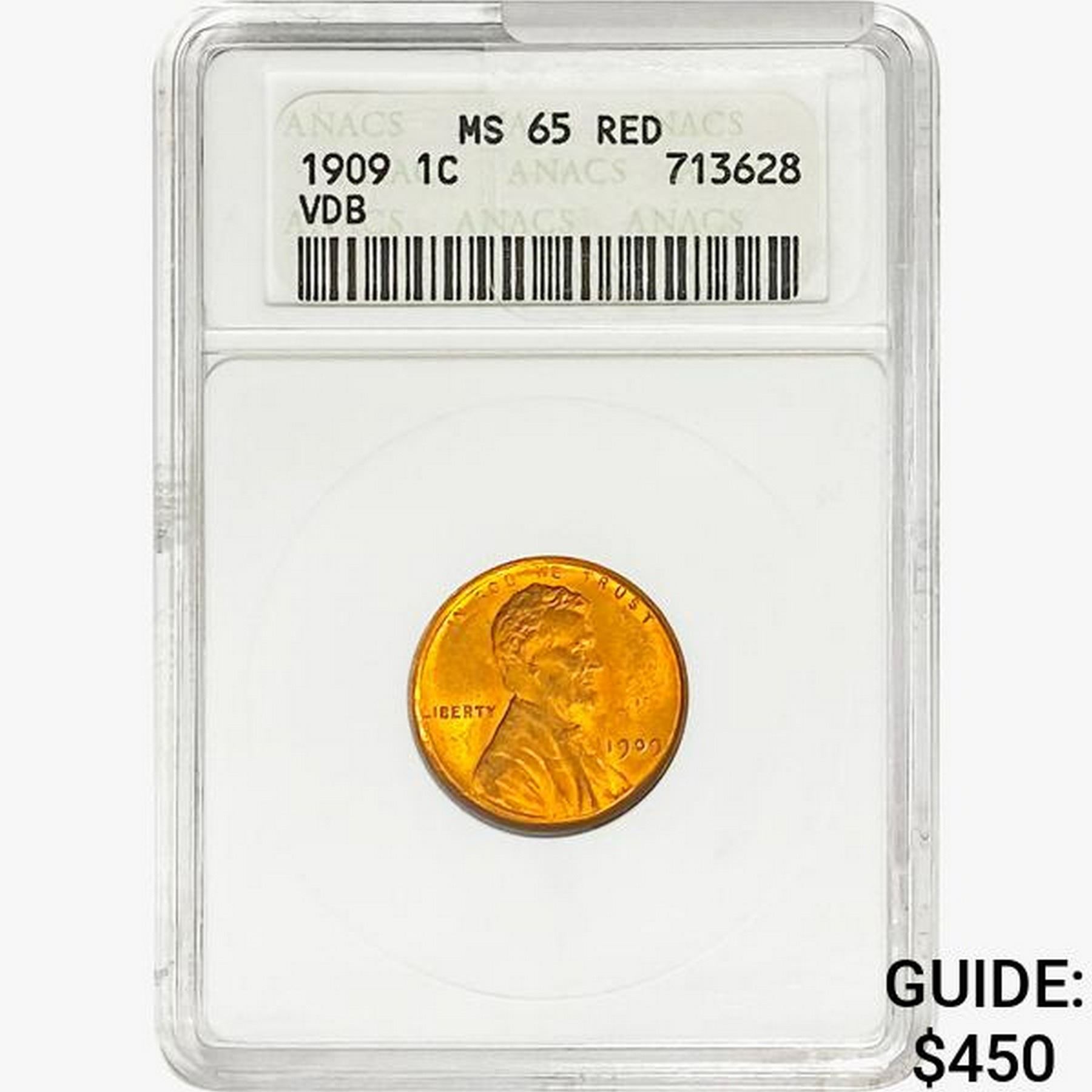 1909 VDB Wheat Cent ANACS MS65 RED