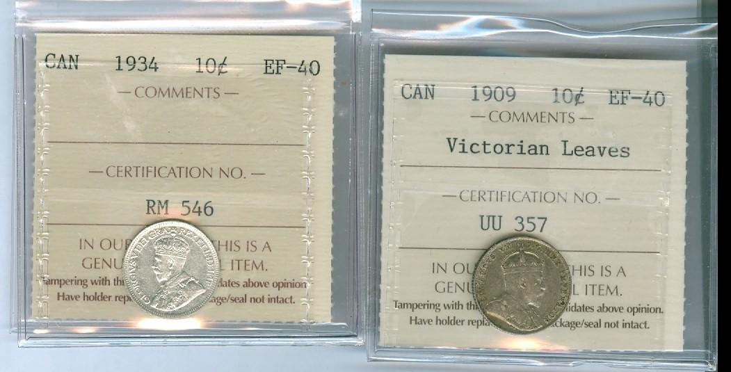 1909 Vict. Lvs. And 1934. Lot of 2 ICCS graded 10¢ coins, both EF40.