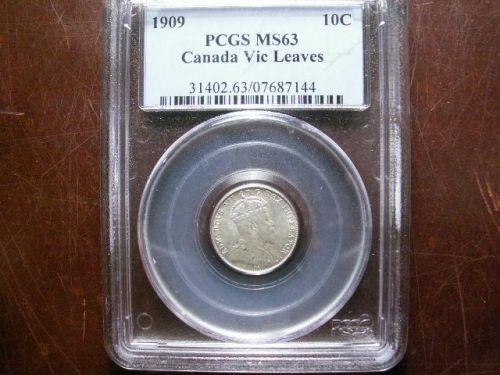 1909 Victorian leaves 10¢ PCGS MS63. A full white and lightly frosted finish.