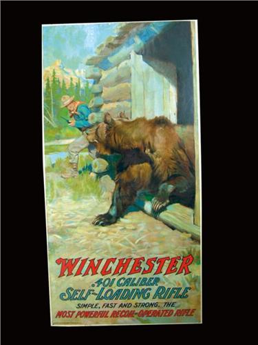 1909 Winchester Poster, mounted on masonite. Depicting bear coming out of a log cabin. Strong colors, some restoration throughout for tears and holes, fair condition. One of the great poster images for firearms 15 X 29 3/4 inches.