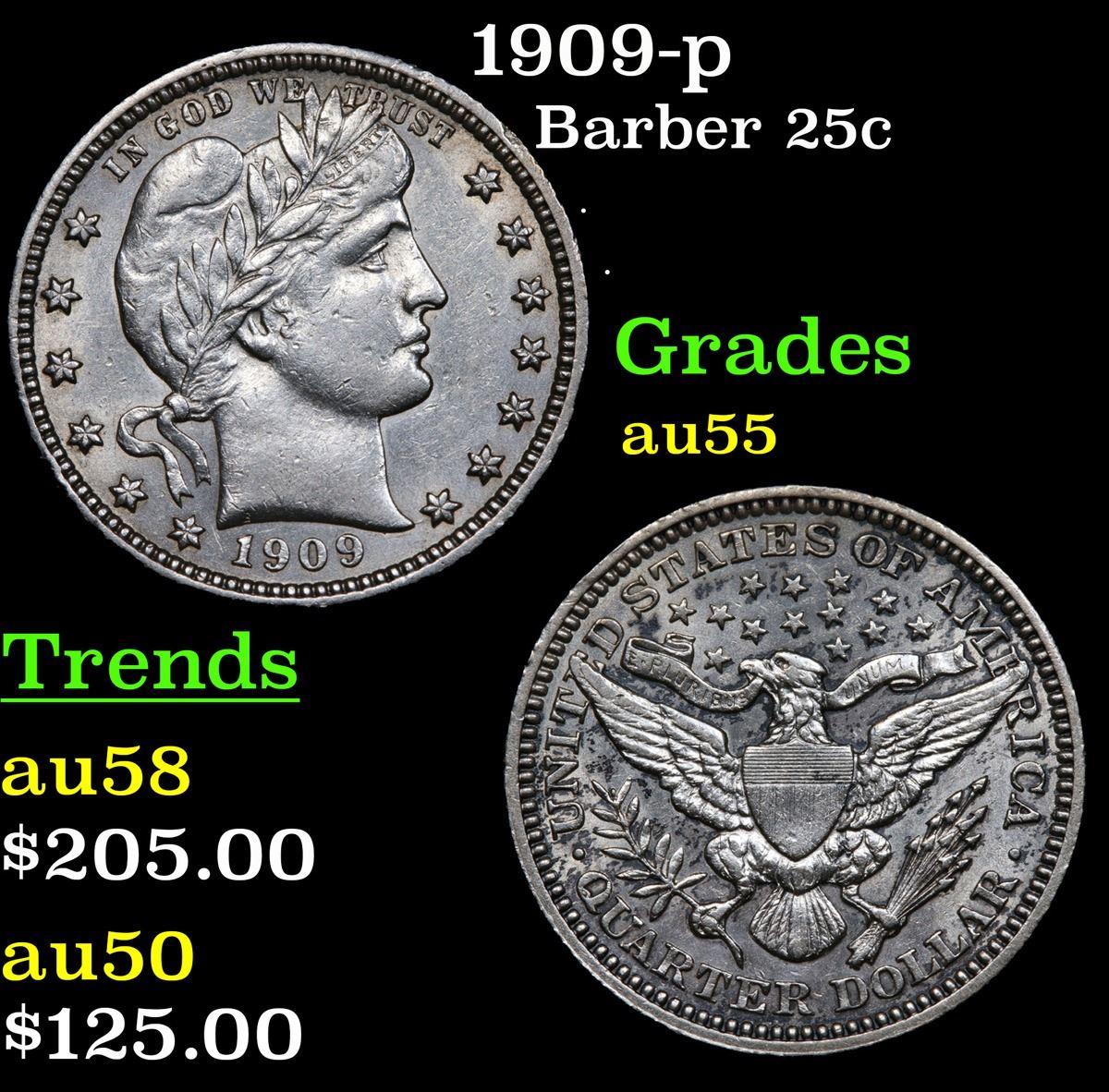 1909-p . . Barber Quarter 25c Grades Choice AU.
