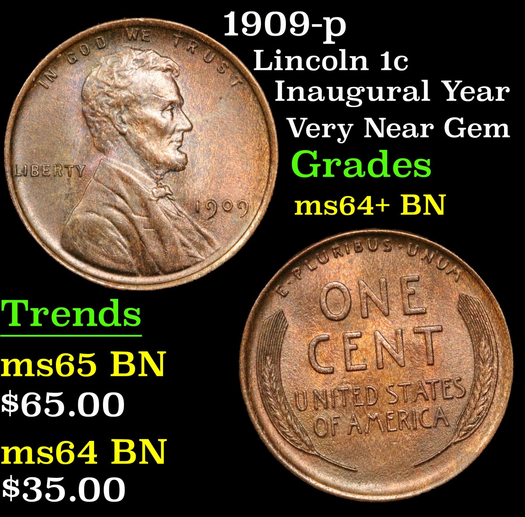 1909-p Lincoln Cent 1c Grades Choice+ Unc BN. Inaugural Year Very Near Gem