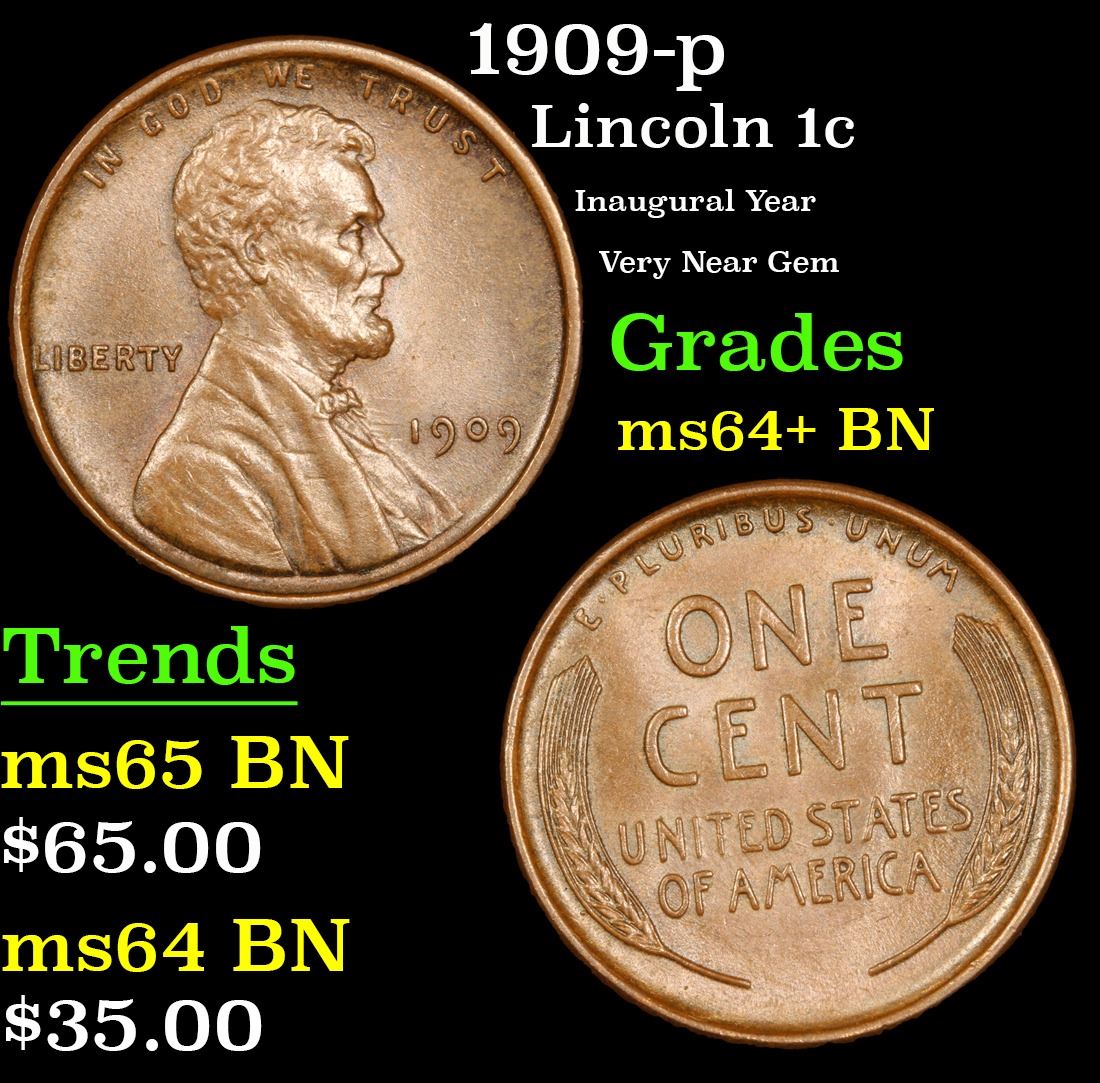 1909-p Inaugural Year Very Near Gem Lincoln Cent 1c Grades Choice+ Unc BN.
