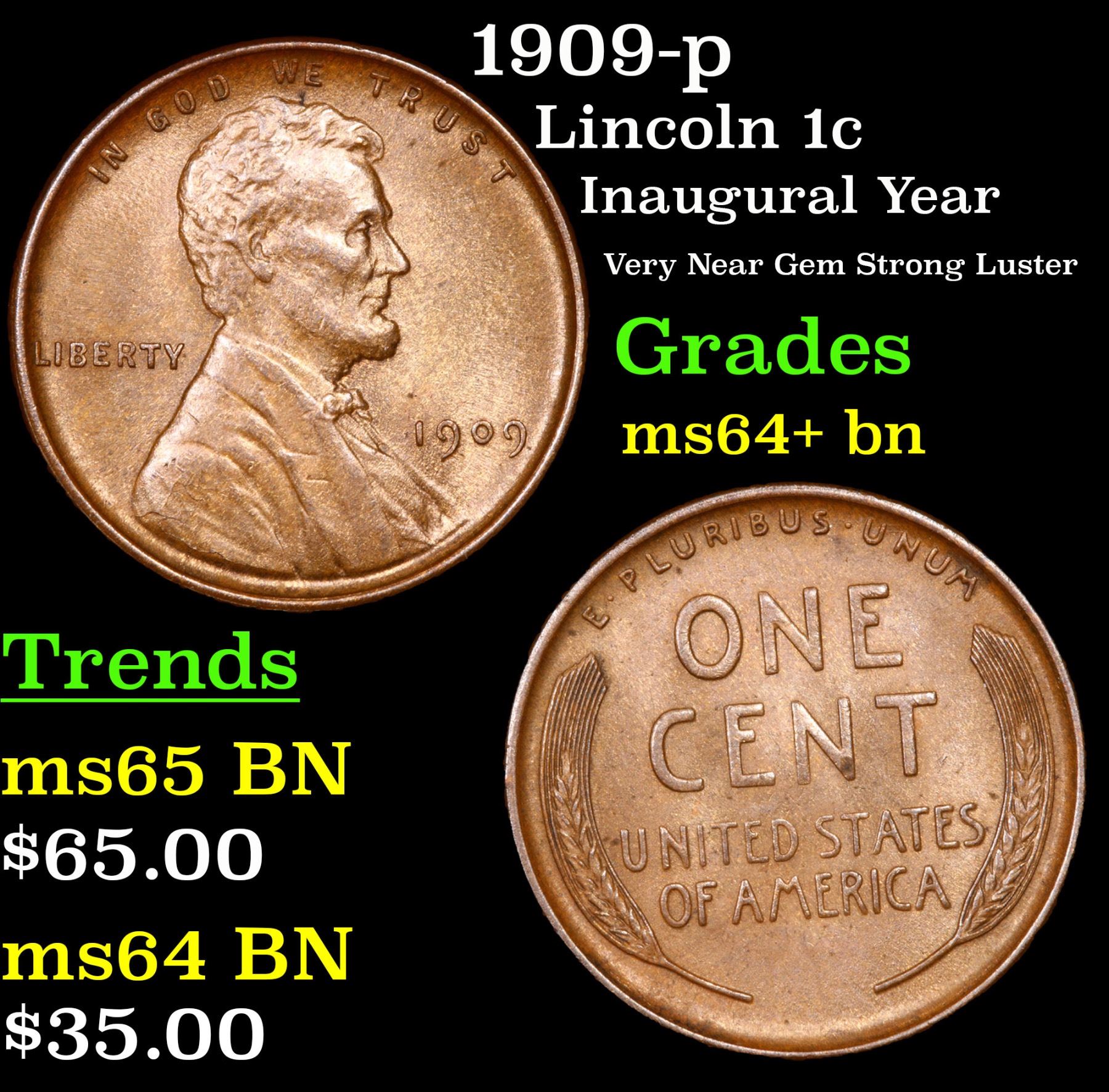 1909-p Inaugural Year Very Near Gem Strong Luster Lincoln Cent 1c Grades Choice+ Unc BN.