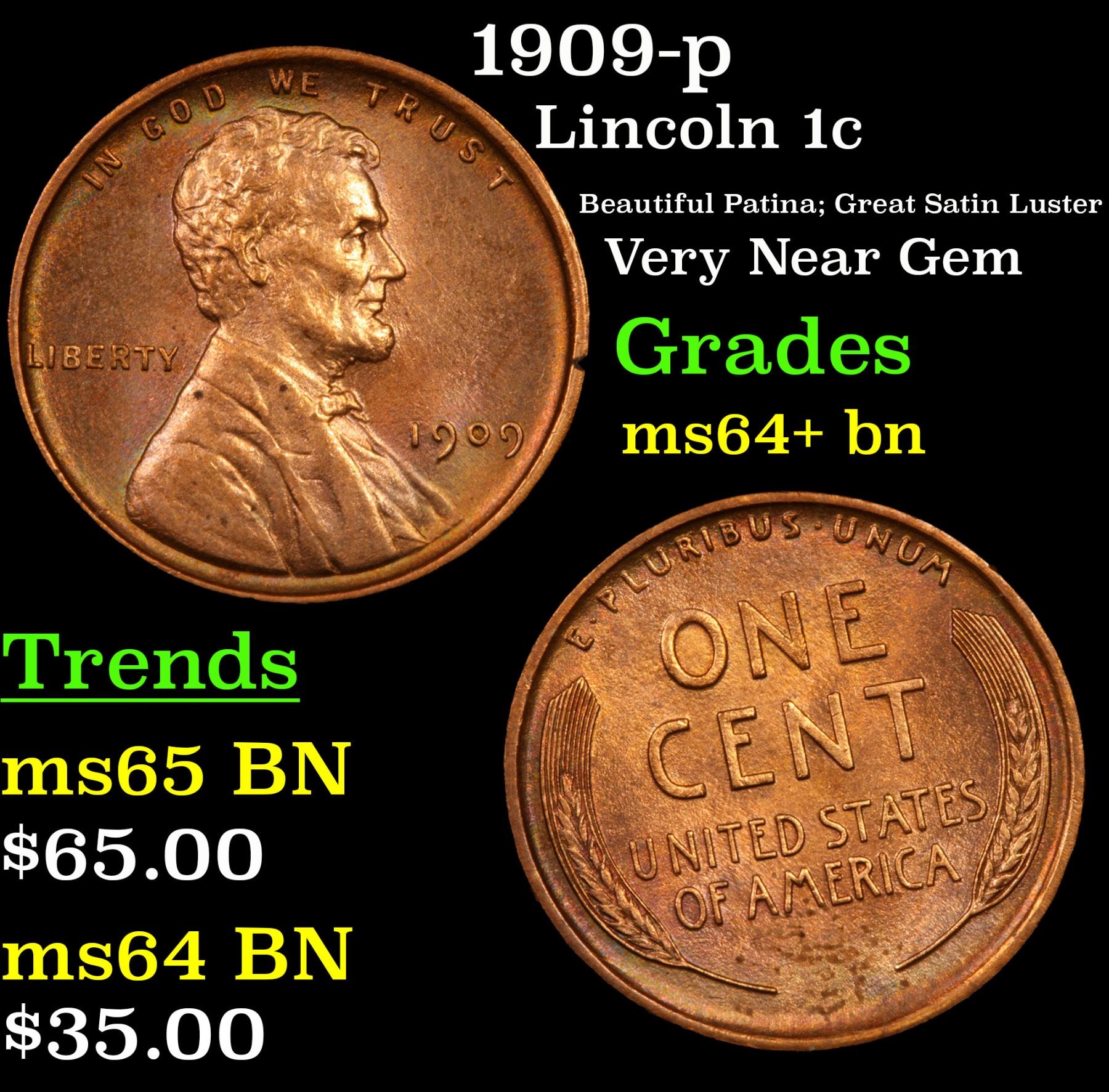 1909-p Lincoln Cent 1c Grades Choice+ Unc BN.