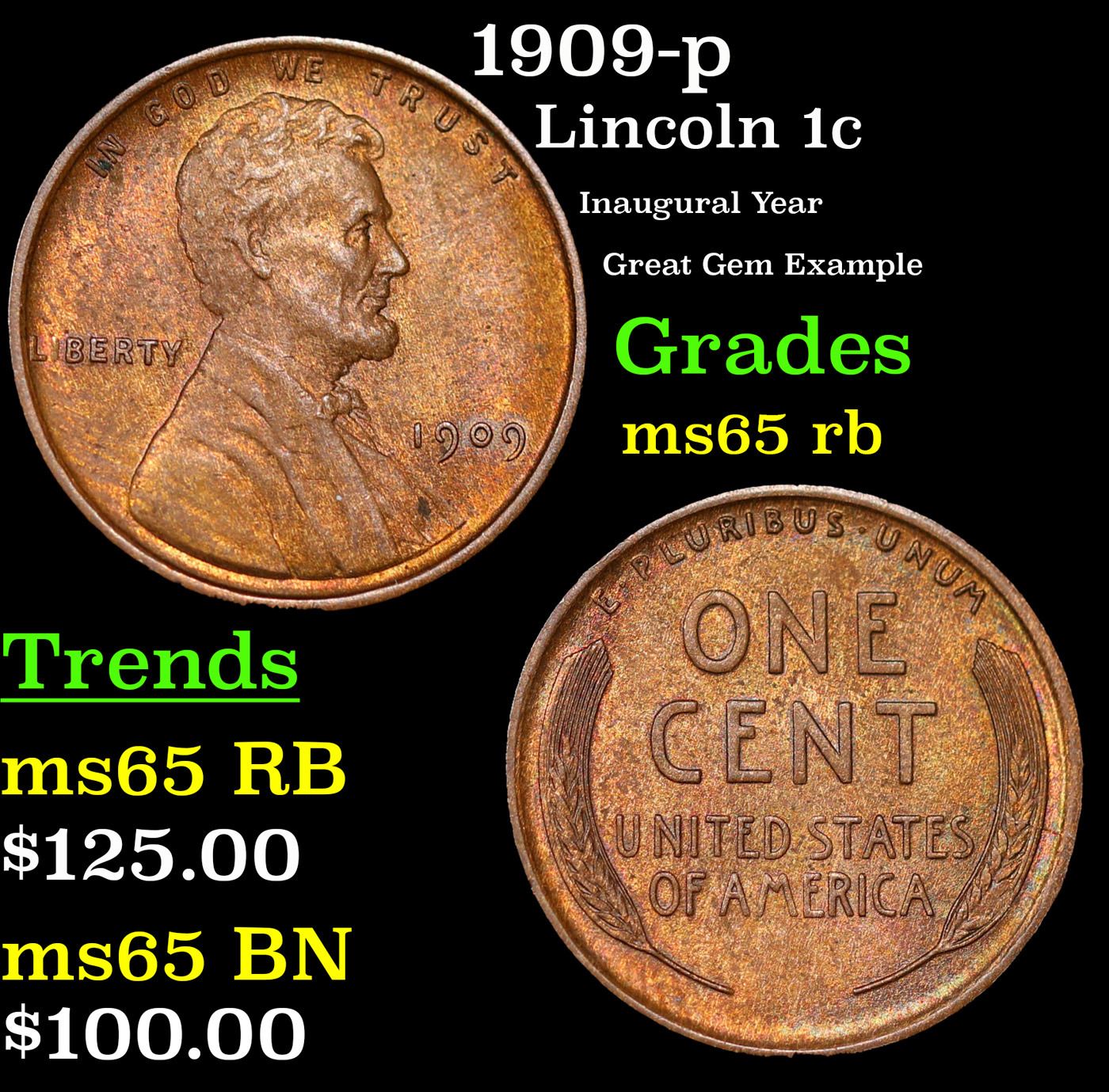 1909-p Lincoln Cent 1c Grades GEM Unc RB.