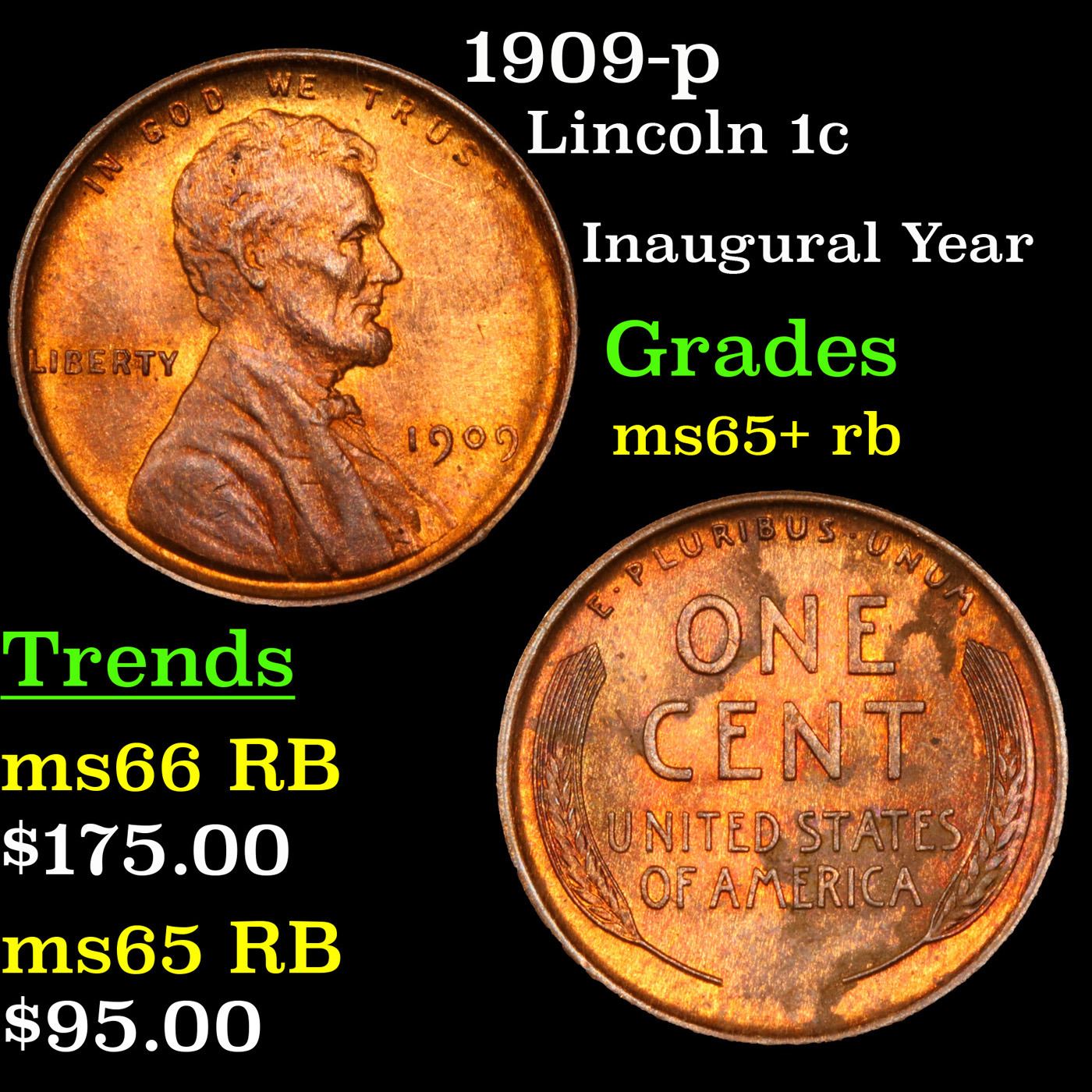 1909-p Lincoln Cent 1c Grades Gem+ Unc RB.