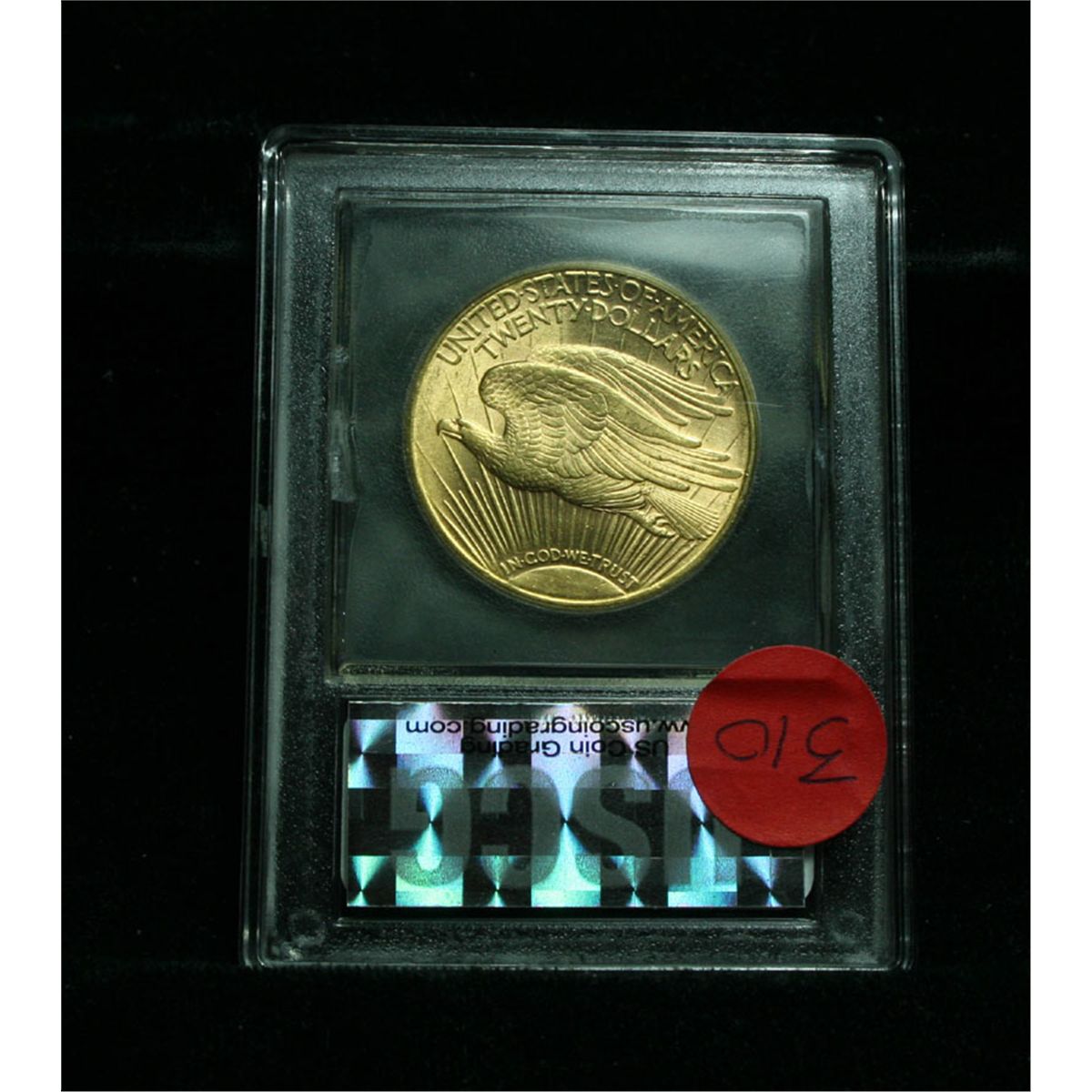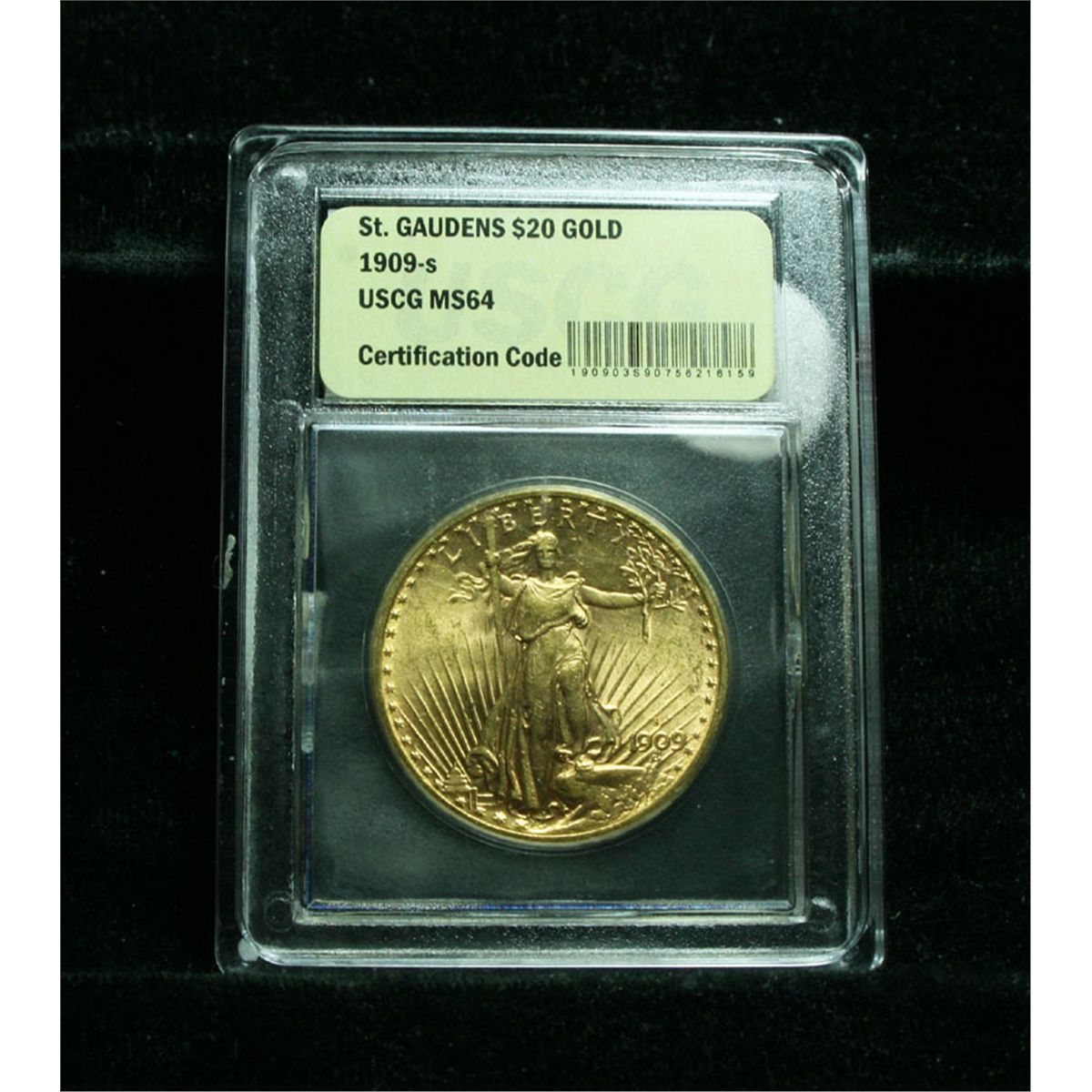 This is a Great Example of a Saint-Gaudens $20 Gold. Nice Luster and Strike. In 1907 Augustus Saint-Gaudens redesigned the $20 piece, employing as the obverse motif the figure of Miss Liberty striding forward. The initial Saint-Gaudens design was struck in high relief, giving the coins an almost sculptured appearance. The date was expressed in Roman numerals, MCMVII. Some 11,250 of these coins were struck, after which the design was modified to a shallow format to permit production on high speed coinage presses. This coin weighs 33.40 grams. It is a 90% Gold Dollar BU Encapsulated and Graded ms64 by USCG. PCGS's Price Guide lists an ms64 at $2450 and NGC's Price Guide lists an ms64 at $2720. The Wholesale Greysheet lists an ms64 at $1980+. Estimated Value: $2300.