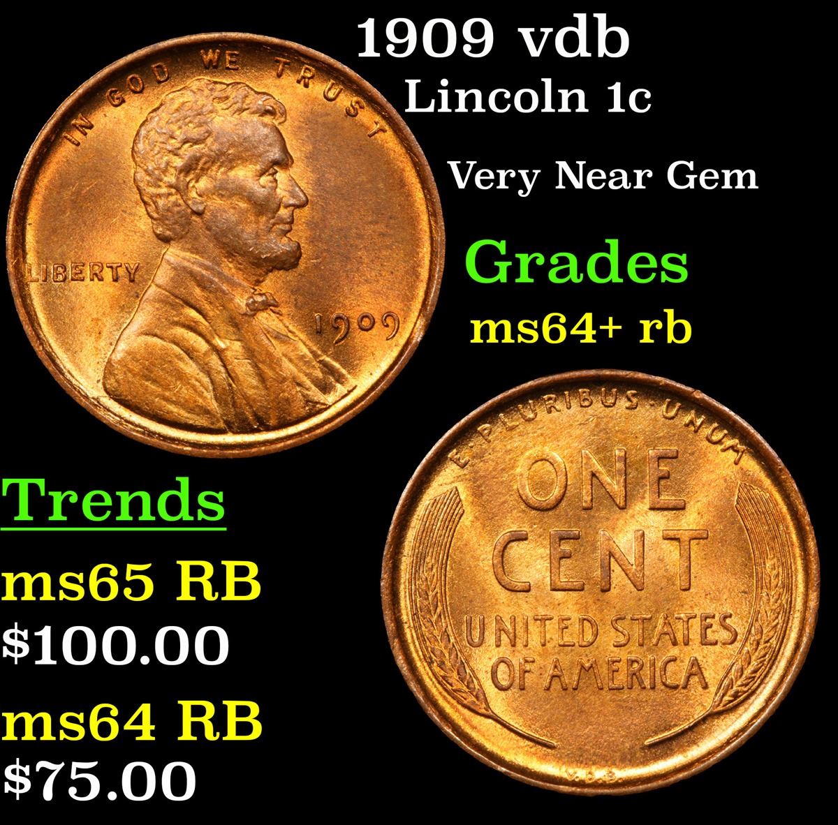 1909 vdb Lincoln Cent 1c Grades Choice+ Unc RB. Always sought after date. Always popular.