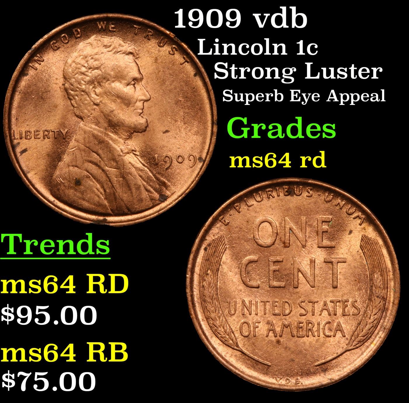 1909 vdb Lincoln Cent 1c Grades Choice Unc RD. Always sought after date. Always popular.