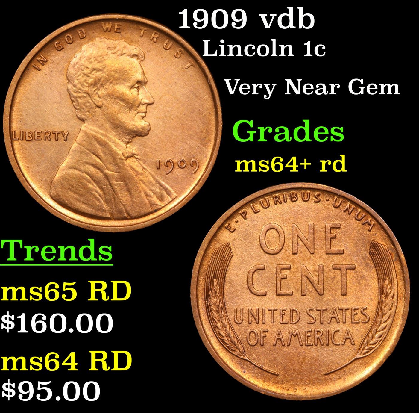 1909 vdb Lincoln Cent 1c Grades Choice+ Unc RD. Always sought after date. Always popular.