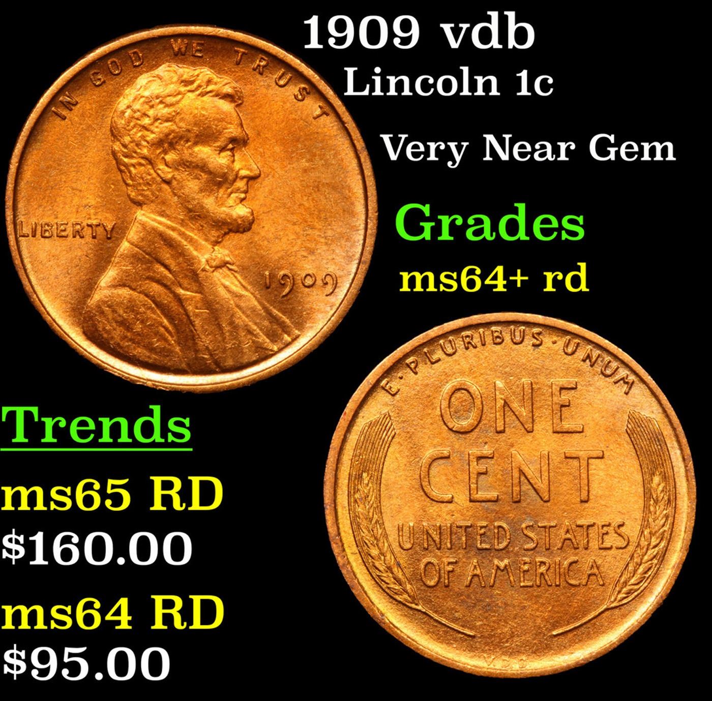 1909 vdb Lincoln Cent 1c Grades Choice+ Unc RD. Always sought after date. Always popular.
