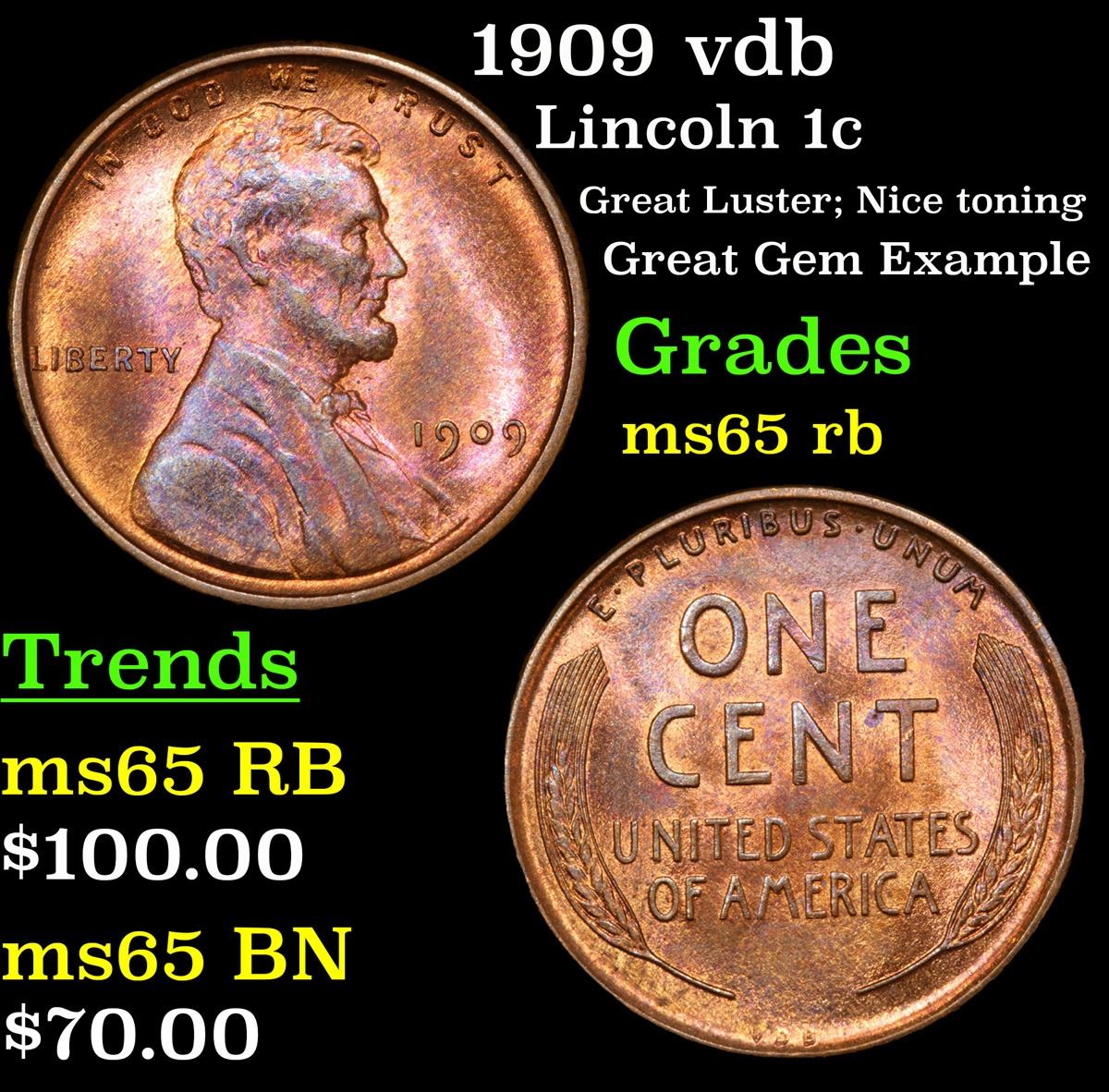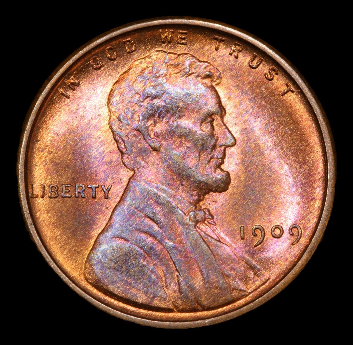 1909 vdb Great Luster; Nice toning Great Gem Example Lincoln Cent 1c Grades GEM Unc RB. Always sought after date. Always popular.