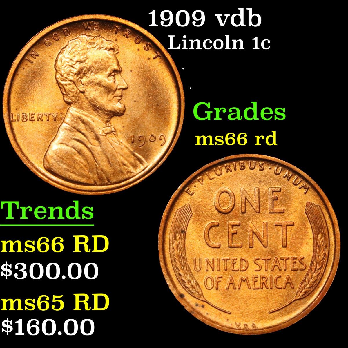 1909 vdb . . Lincoln Cent 1c Grades GEM+ Unc RD. Always sought after date. Always popular. A Corey's Pick, Bid to Win Coin