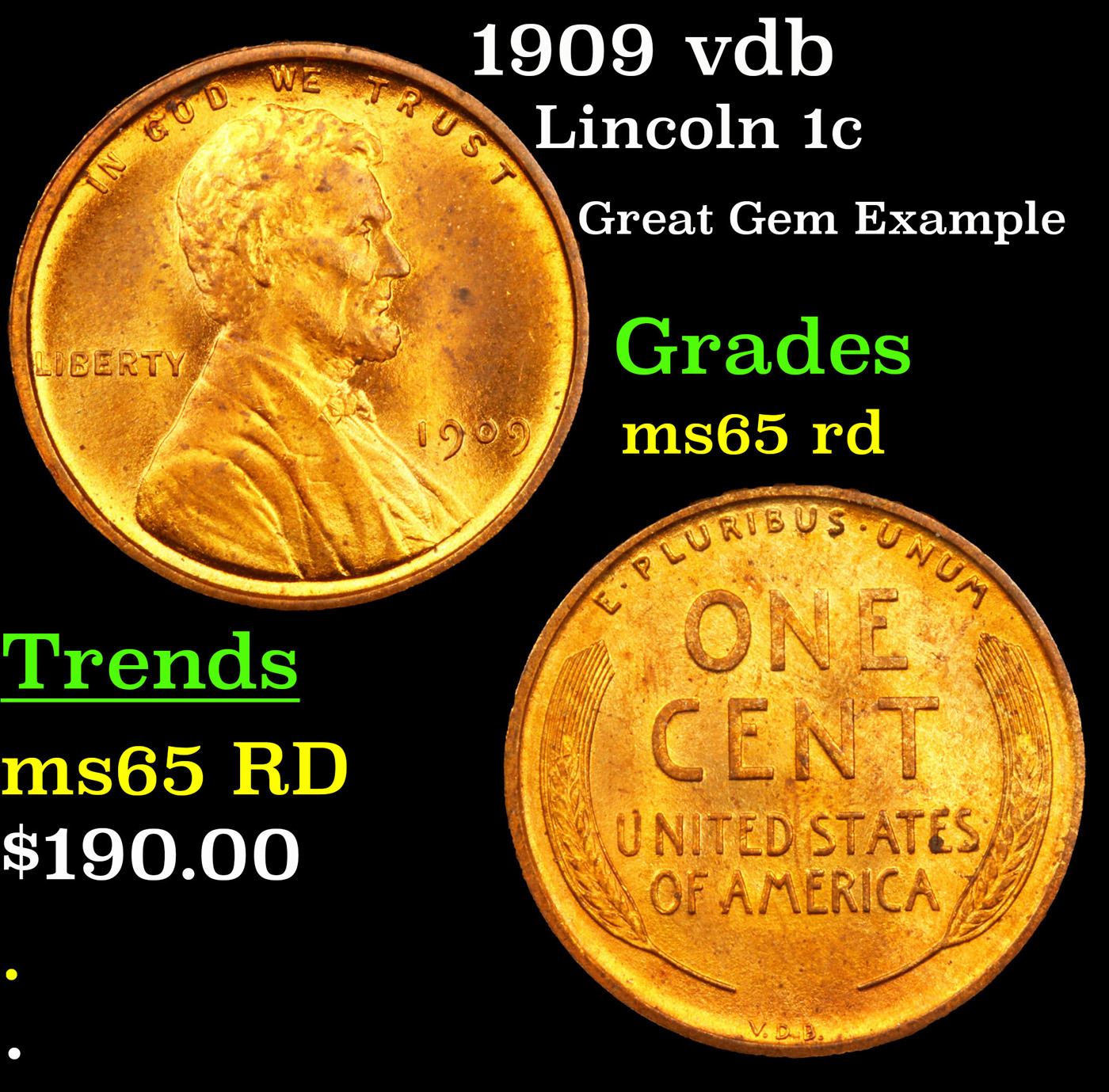 1909 vdb Lincoln Cent 1c Grades GEM Unc RD. Always sought after date. Always popular.
